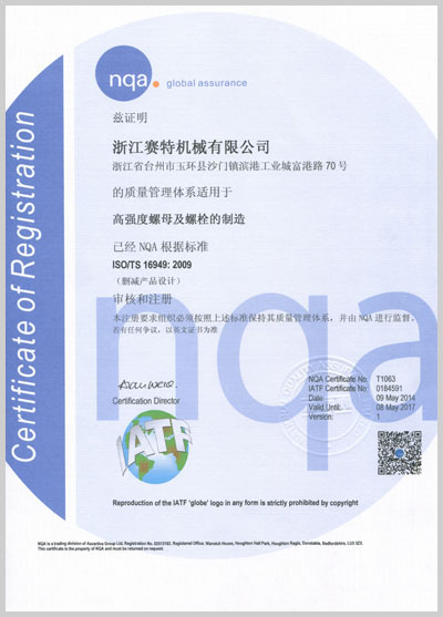 公司于2002年通過ISO9001:2000國際質量體系認證,2008年6月通過ISO/TS16949質量體系認證�,F有員工110余人,管理人員30人,工程技術人員32人,擁有熱鍛機組、冷鐓機組、數控車床、自動攻牙機、冷擠壓機、熱處理、退火爐等先進成套生產設備并配置擁有洛氏硬度計、自動互流探傷機、拉力試驗機機、材料自動分選儀、金相分析儀、萬能螺紋顯微鏡、鹽霧試驗機智能電解測厚儀、沖擊試驗儀及沖擊試樣缺口投影儀等高端精密檢測儀器的實驗室。公司以專業的隊伍,嚴謹的管理,超卓的設備,全力打造賽特品牌的高強度螺母、螺栓。